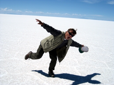 hundert Meter tief. Vor uns liege. 120 km auf der flachen Salzfläche. über der Andenkette im Osten des Solar türmen sich Wolken, die seltenen Regen ankündigen. Das Salz wird an einigen Stellen auch abgebaut. Bei so viel Weite fällt auch dem Alten das Springen nicht schwer. |