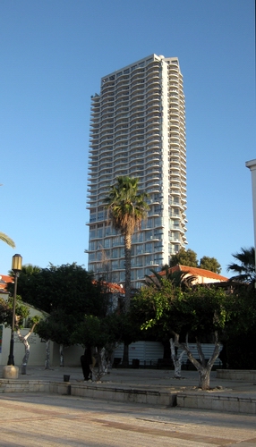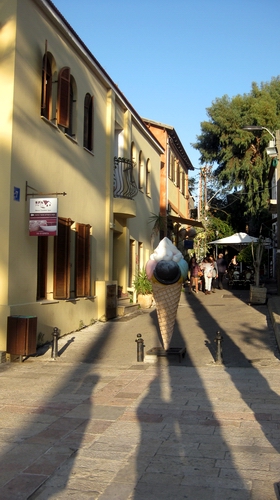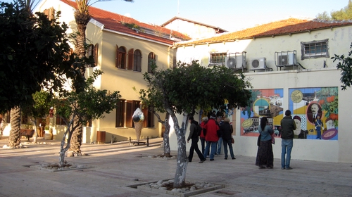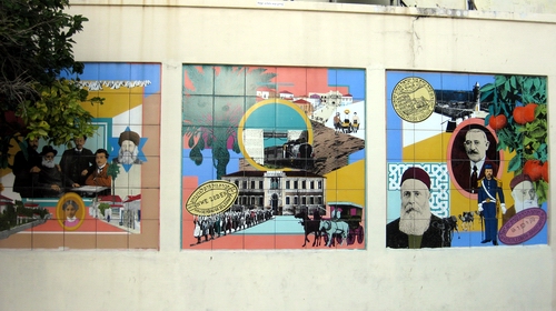 Am Nachmittag zeigt mir Naama Brill das älteste Viertel Tel Avivs, Neve Tzedek. Die Wandbilder erinnern an den Gründer der Stadt durch Akiva Arie Weiss, den ersten Bürgermeister. Gegen den Bau des Hochhauses im Hintergrund gab es Widerstand. Die Bodenspekulation hat sich durchgesetzt. Nun steht es da. Ein Fremdkörper. |