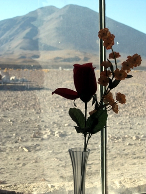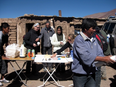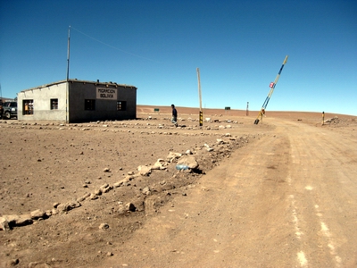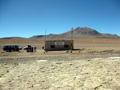 Am Morgen mit einem Bus zur bolivianischen Grenze. Dort Aufteilung der Teilnehmer auf Jeeps. Ich fand mich zusammen mit einer Chilenin aus Santiago, ihrer Tochter und ihrer Schwester und einem französischen Ehepaar aus Annemasse am Genfer See. Die chilenische Grenzabfertigung war schon in San Pedro, oben in den Bergen die an Wim Wenders (Paris Texas) erinnernde bolivianische Grenzkontrolle. Erstes Piquenique-Frühstück in 4000m Höhe. Von dieser Höhe werden wir in den nächsten Tagen nicht mehr herunterkommen. Im blauen Hemd unser Fahrer Xavier. |