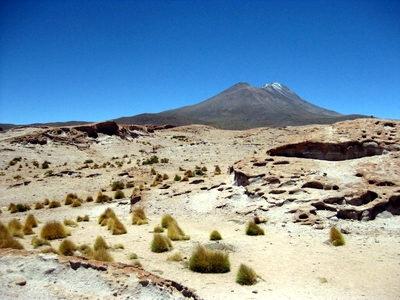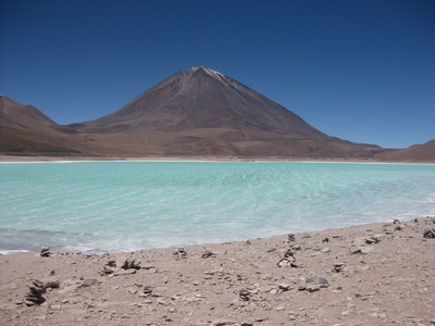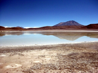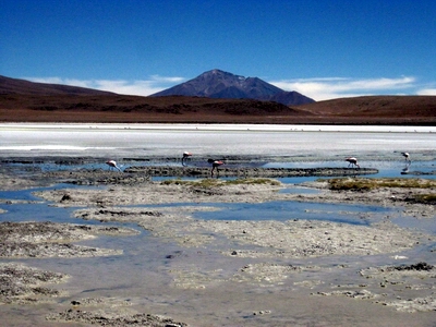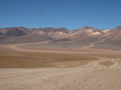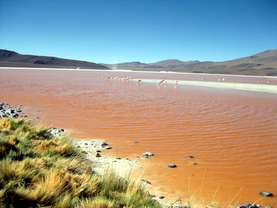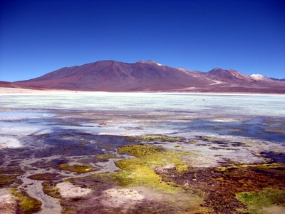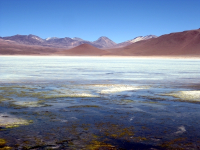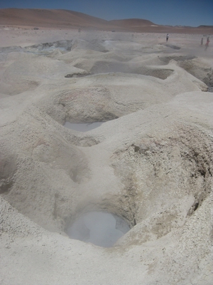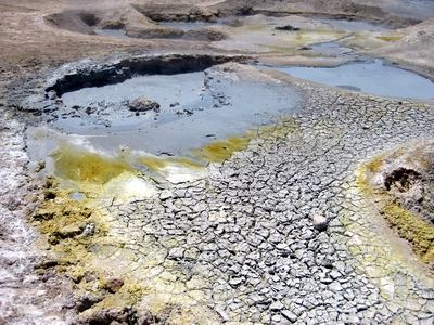 Die Fahrt geht durch eine faszinierende Andenwelt: Salzseen mit einer beeindruckenden Farbenvielfalt, je nach dem vorherrschenden Mineral: Salze Borax..., wüstenartige Hochebenen, und noch einmal kleine Geysire. |