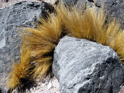 Auch das Kleine sehen: das harte Puna-Gras, das über weite Strecken die einzige sichtbare Vegegation darstellt: Paja brava; nicht einmal die Lamas fressen es. Die wenigen Menschen in dieser lebensfeindlichen Welt decken damit die Dächer ihrer Häuser. |