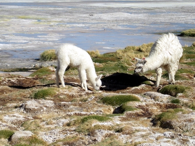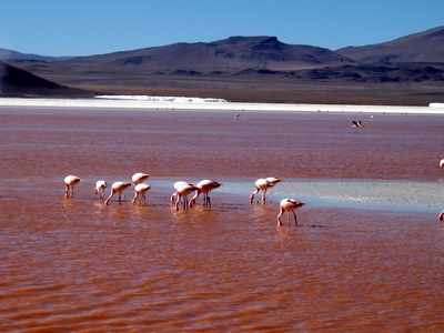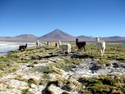 In fast allen Seen stehen die philosophierenden Flamingos. Sie leben von Plankton, das in diesem See für die rote Farbe sorgt. Und am Ufer die erste Lama-Herde, friedlich. |
