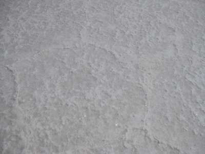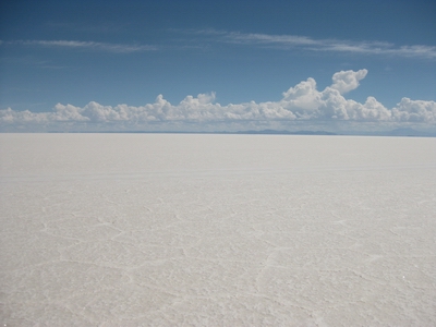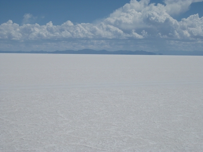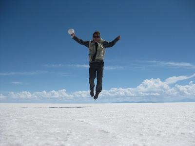 hundert Meter tief. Vor uns liege. 120 km auf der flachen Salzfläche. über der Andenkette im Osten des Solar türmen sich Wolken, die seltenen Regen ankündigen. Das Salz wird an einigen Stellen auch abgebaut. Bei so viel Weite fällt auch dem Alten das Springen nicht schwer. |