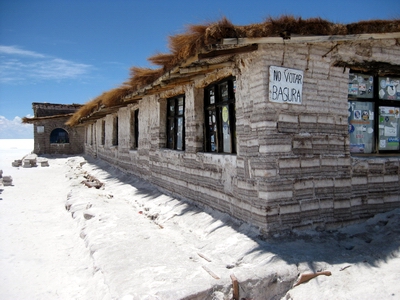 Die zweite übernachtung in einem aus Salzblocks gebauten Hotel. Blick auf den Salar de Uyuni, den wir am dritten Tag queren werden. |