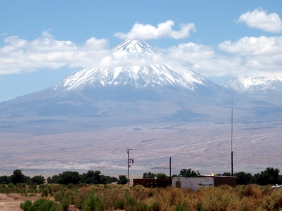 Pozo 3/Brunnen 3, einer kleinen Oase 3 km von San Pedro. Im Hintergrund der alles beherrschende Vulkan