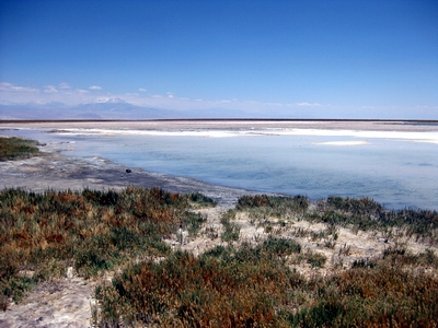 Lagunas las Cejas: In den nächsten Tagen Fahrradtouren rund um San Pedro. durch die Wüste: Salzseen oder beser -teiche. Im Hintergrund der Licamcabul.