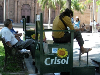 ![]() ![]() Auch die Schuputzer nehmen das Leben gelassen, machen mal Pause; die junge Frau passt auf, dass sich keiner außer der Reihe die Schuhe selber poliert. In La Paz tragen die jungen Männer des Metiers schwarze Guerillero-Masken. Das sieht bedrohlich aus, gehört aber zum Straßenbild. Dort hätte ich kein Foto riskiert, obowhl die Jungens mit ihren schwarzen Masken ganz unaufdringlich und friedlich ihrem Metier nachgehen. Auch der Schuhputzer hält mit seiner politischen Meinung nicht hinter dem Berg. Klar, dass er für das 'Nein' wirbt. |