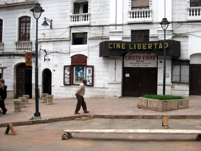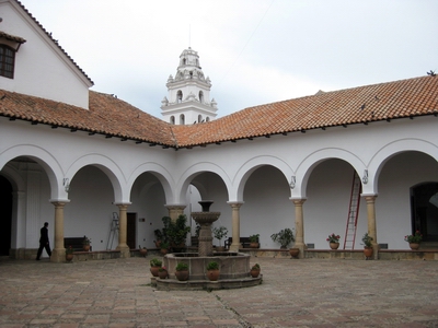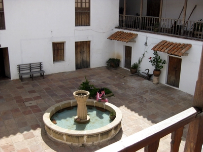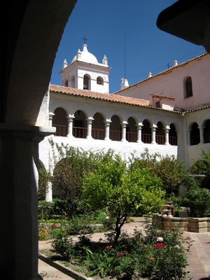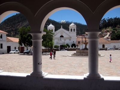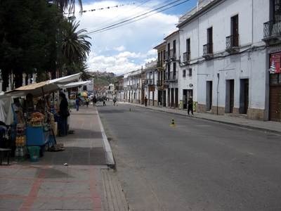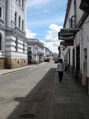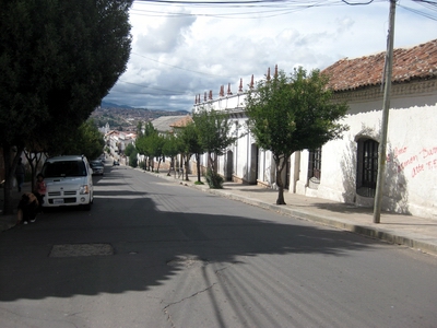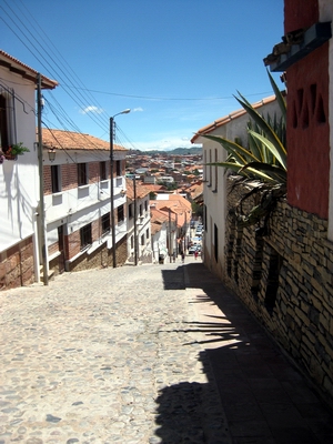 den Fuß vom Gas zu nehmen. Wir haben's überstanden. Die Unterkunft: eine schöne Jugendherberge mit Spanischkursen für junge Leute vor allem aus Deutschland, Studenten in einem Austauschsemester, Leute im Freiwilligen sozialen Jahr, etc. Eifriges Lernen; die saßen morgens um sieben an ihren Computern und sonstigen Materialien. Irgend wann nach drei Monaten drohte eine Prüfung. Erstaunlich wie viele junge Leute nicht einfach in der Welt herumreisen, vielmehr ernsthaft den Kontakt mit anderen Ländern suchen. Sie waren mir schon vorher hier und dort begegnet. Eine positive Seite der Globsalisierung. Die drei anderen verließen die Herberge am vorletzten Abend. Ich gehe wieder meine eigenen Wege und suche meinen eigenen Rhythmus. Sucre ist eine weiße, freundliche Stadt. Die Herberge oben am Hang über dem Zentrum. Die Stadtmitte mit kolonialem Flair. |