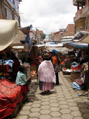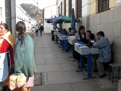 Die Regierung von Evo Morales hat stolz verkündet, dass Bolivien nach einer erfolgreichen Alphabetisierungskamagner den Analpabetismus überwunden hat. Werden die Schreiber, Briefsteller in dieser Straße jetzt arbeitslos? Zu befürchten ist: "Nein", weil erste Schreib-und Lesererfolge ein erster Schritt sind, der wenn nicht weiter daran gearbeitet wird, wie eine Spur im Sand verweht werden wird. |