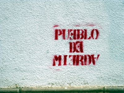 Was sich der Sprayer gedacht hat, bleibt offen: Zugerechtgerückt ergeben die Buchstaben diese Nachricht (an wen?): 'Pueblo de mierda', 'Scheißvolk'. |